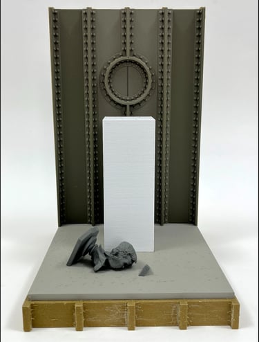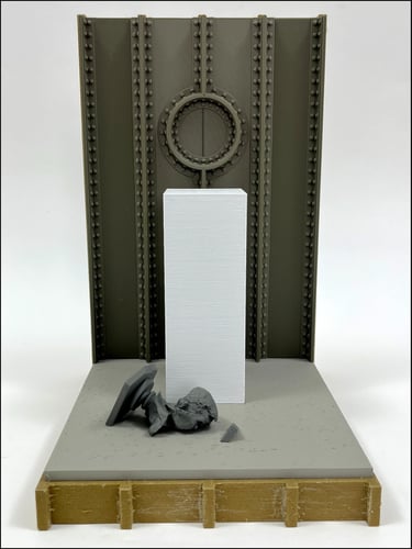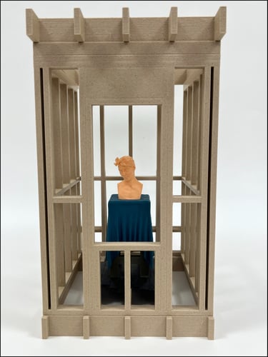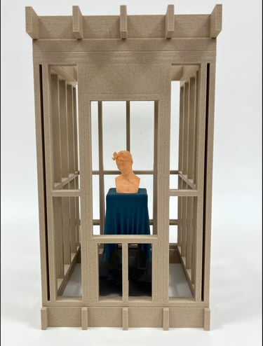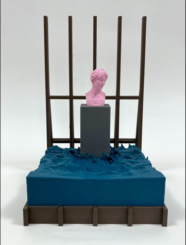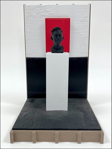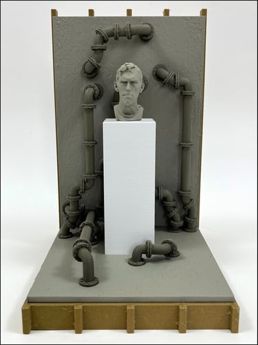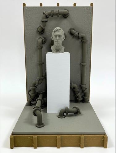 Sur une ossature, aux dimensions de maquette, rappelant le décor de théatre ou de cinema, s'érige une scène inspiré de la vie courante ou de la fiction. Chaque proposition est composée de fichiers numériques trouvés sur le net, de photogrammétrie et de modelage à l'aide de logiciel de dessin 3d. Le résultat est obtenu à l'aide d'imprimante 3d de type "FDM"(fused deposition modeling).